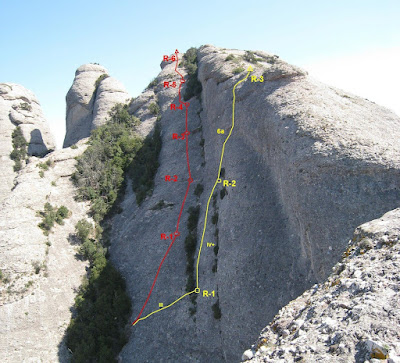 L2 5c/Ae o supuestamente 6c+ 25m. El principio es por placa para meterse de lleno en el primer tramo de fisura. Antonio lo prueba en libre y lo encuentra muy difícil aunque el tío lo va solventando con algún reposo, después al subir me doy cuenta observando los supuestos cantos y la dificultad de los pasos unido a lo tieso casi desplomado del tramo que es muy muy difícil, según Antonio podría ser 7a/7a+. en mi arnés estratégicamente colocado me encuentro un pedal, jeje, pues va a ser que lo voy a desplegar por que en Ao me haré daño que tira patras que te cagas, y al final me hago daño hasta tirando de pedal, como si fuera un micro desgarro muscular en la zona del bíceps de bloquear, me hace dudar al llegar a la R de si me bajo o sigo debido al dolor intenso y continuado. Después del descanso en la R decido seguir, me puede mas la ilusión que tenía por hacer esta vía que el dolor, así que el resto de la vía lo haré prácticamente con el brazo derecho, el izquierdo me servirá solo para equilibrar o para pasos con la mano en oposición a la roca, pero nunca para tibar de brazo.